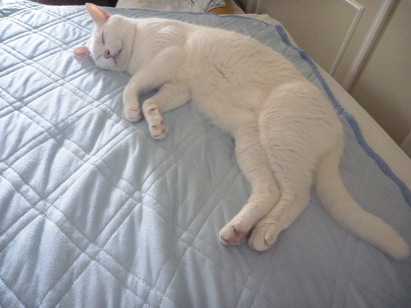 私のベッドの上で寝ています。(笑)