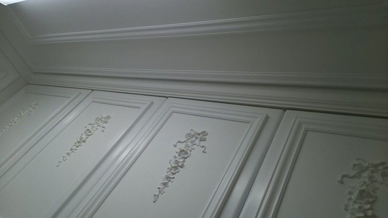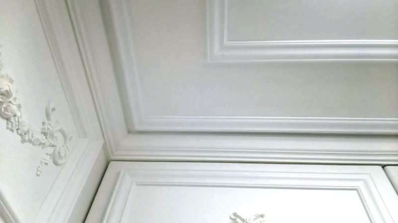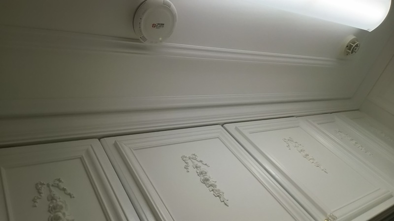 この様に壁紙を剥がして、ドライウォールで白のペイントをして天井廻りを三重に廻しました。