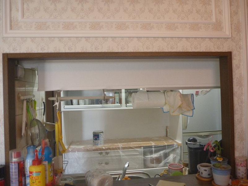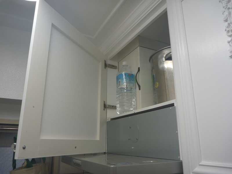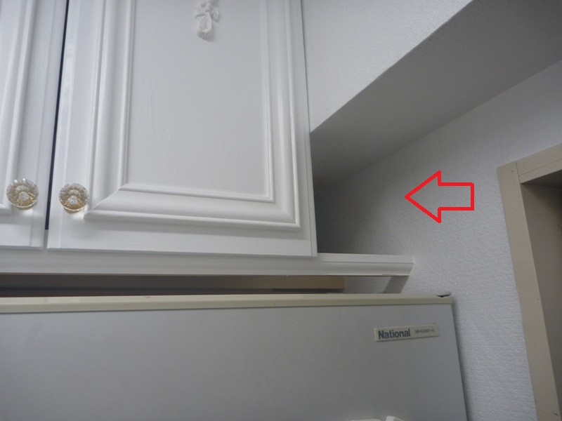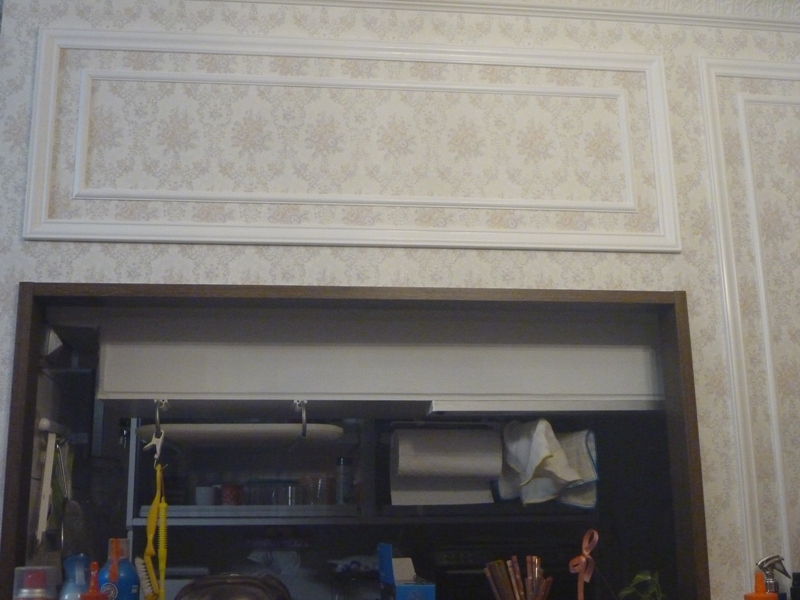吊戸棚の下の部分が見えますので、見えないように壁を貼り、その上に壁紙を貼りました。