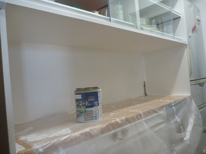 続いて、「食器棚の引き戸の下の未塗装の部分、電子レンジやその他の置いている箇所がありますので、次回塗装の予定」を施工しました。