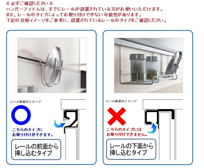 ハンガーアイテムは、それぞれA.レールの前面から挿し込むタイプとB.レールの下面から挿し込むタイプなどのの2種類がある為、これらのレールに応じた選択をしないと取り付けられないので注意が必要です。