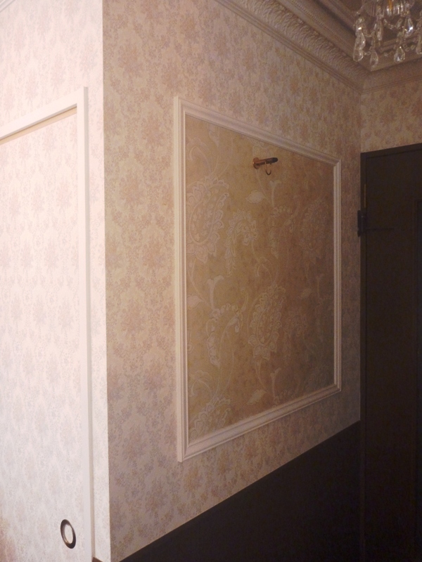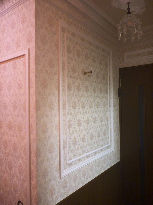 廊下とリビング、ダイニングルームの腰壁はクラシック、その上はフレンチと言うスタイルです。