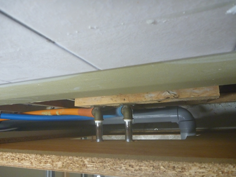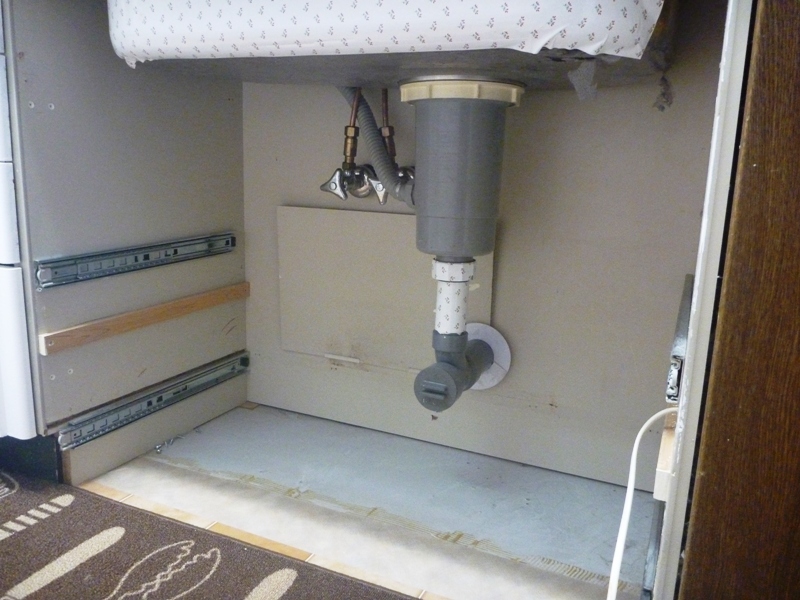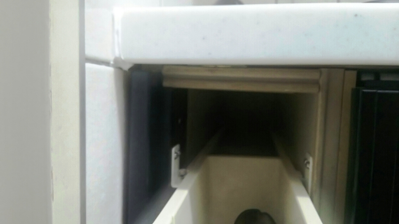 リフォームの続きがありまして、シンク下の左右の引き出しの扉の干渉も解消しましたところ、後は、左右の引き出しの後ろが水道と排水管との干渉部分をすべて削合して、スムーズに出し入れもOKになりました。