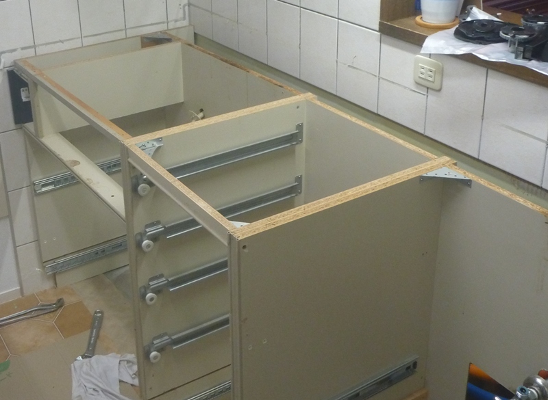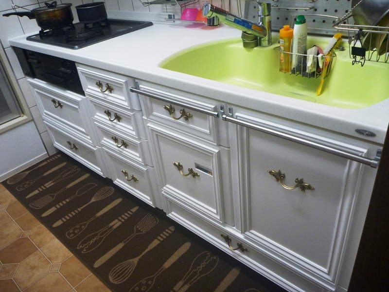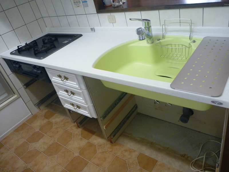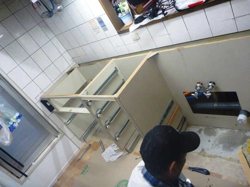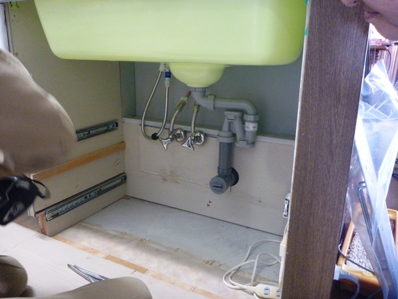 何故なら、シンク下のキャビネットの内部が変わりましたから、引き出しが干渉したりして、当たるところを探して切ったりネジ止めしたりと大変です。