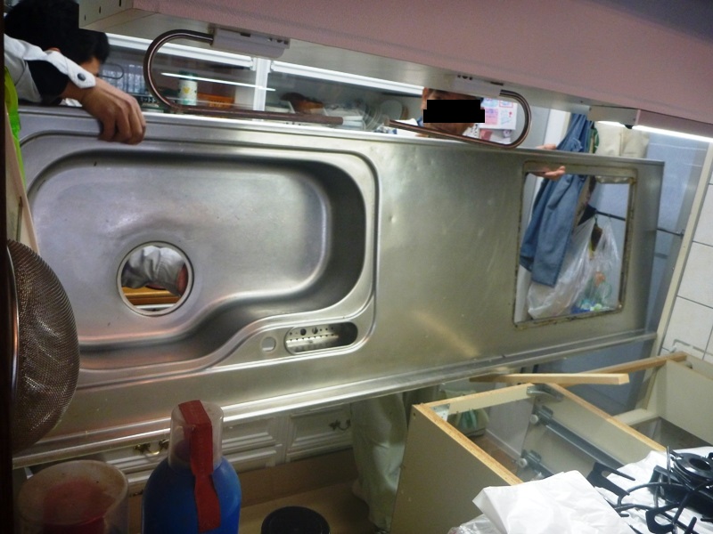 これは、当マンションではキッチンの背面にあった壁がキッチンより下に面材下地が張られておらず、排水配管がむき出しになっていて、キッチンキャビネットは一番左端と右端以外がカウンターが突っ張りになって止まっている状態で、最初のカウンターを外した時、キャビネットが真ん中の所で突っ張りを失い、個々でバラバラになってしまった事によるもので、業者さんにとっては想定外の事だった様です。
