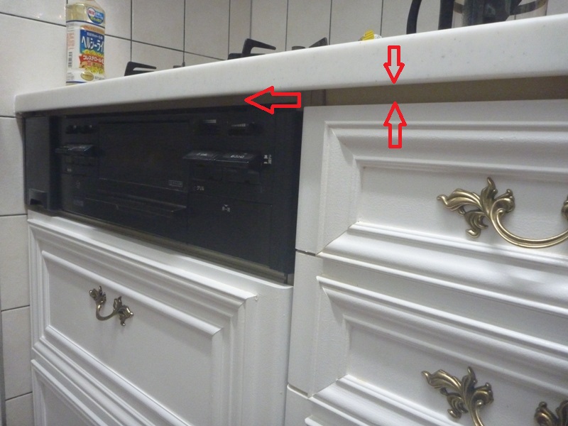 ガスコンロが浮いているのは、カウンターが1センチ低い事によるガスコンロ下の桟(かけはし)
