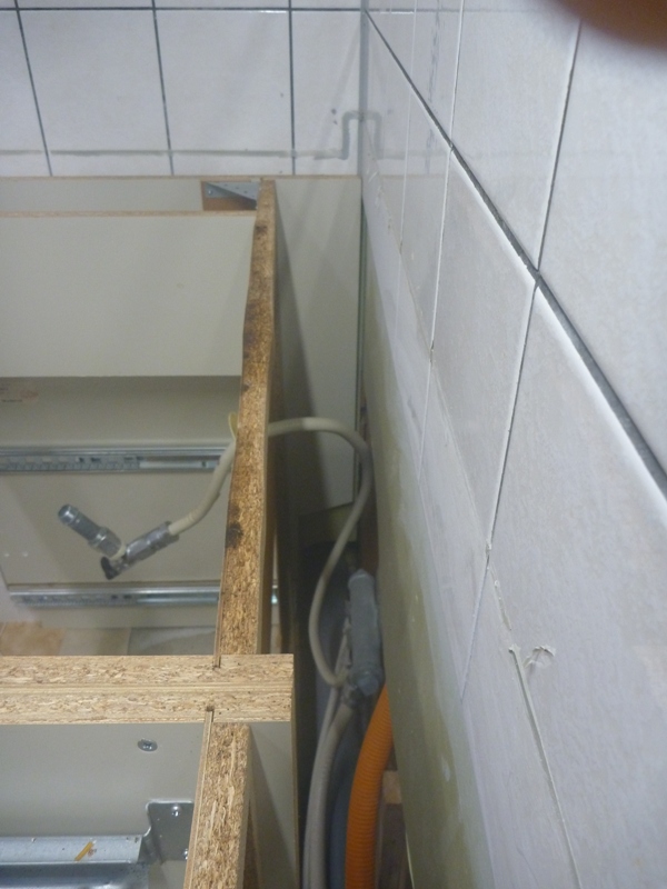 そして、写真では分りませんが、ここまで来るとシンク下の左右の引き出し扉が当たって干渉しており、入らないのです。