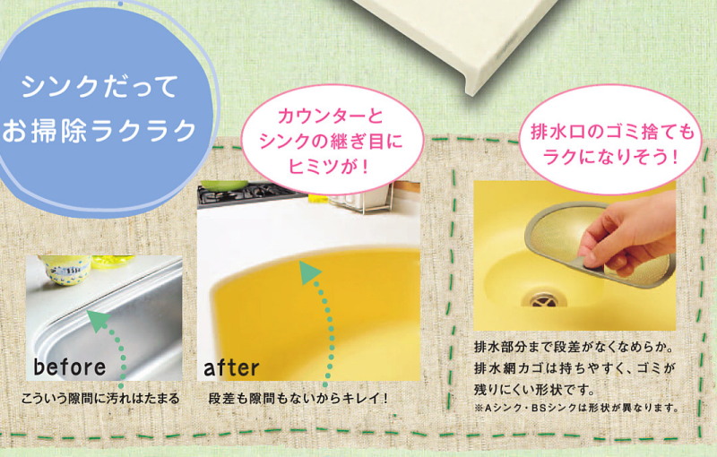 どういう事かと言いますと、シンクも人造大理石で出来ていて、カウンターの奥やシンクとのつなぎ目、排水部分まで隙間や段差がなく、汚れがたまりにくい様な感じです。