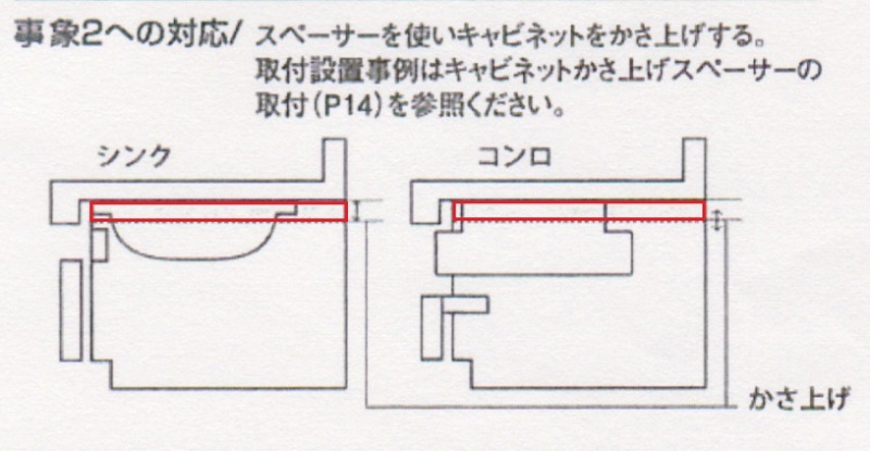 があった場合には、キャビネットかさ上げスペーサーを既存キャビネットの上面木口に取り付ける事で対応してもらえるか?これだけは確認して下さい。