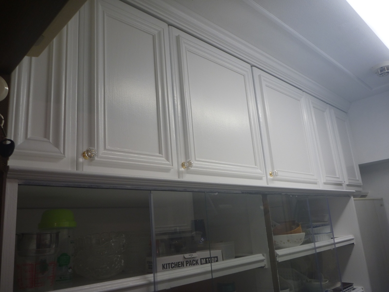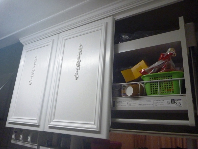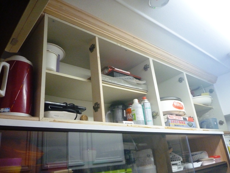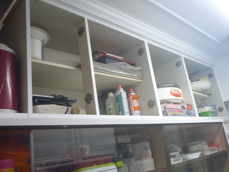 下の写真は、上記のキッチンの反対側の食器棚の上にある戸棚ですが、吊り戸棚ではないんですね。