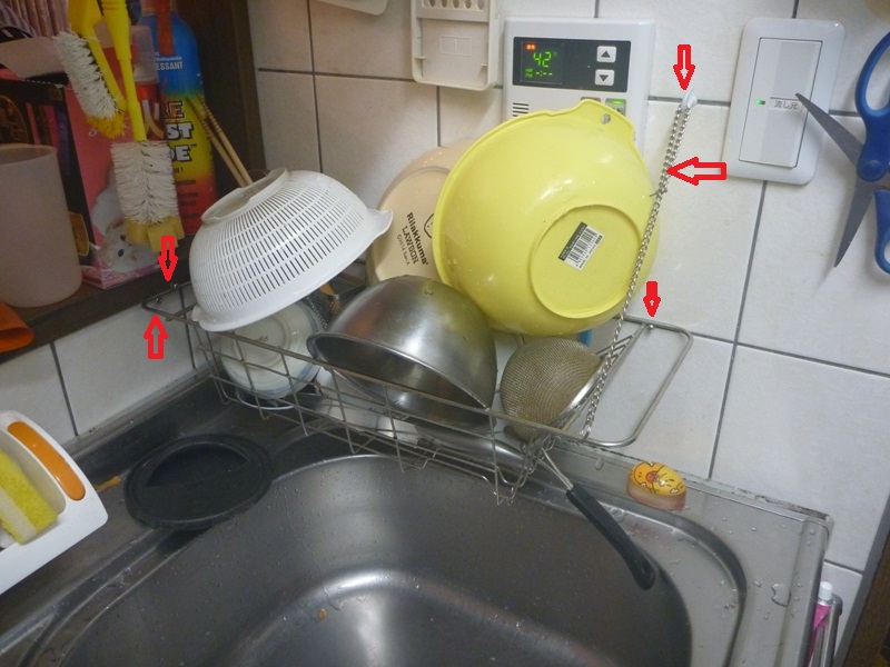 今まではシンクの上に置いていましたが、場所を取りますのでなんとかならないものかと思案した末にこの様な設置になりました。