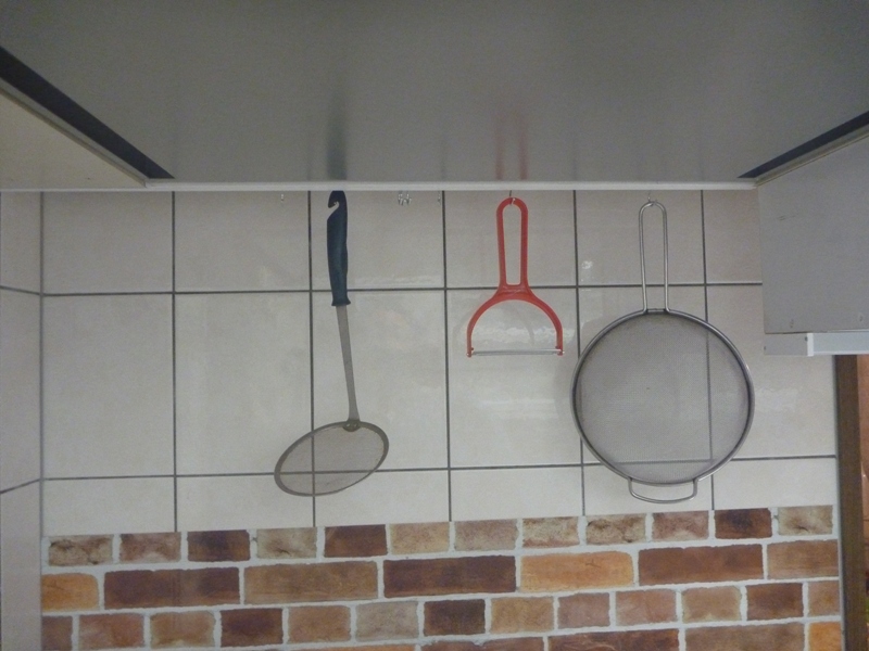 レンジフードの所に、長さ60センチのステンレスのパイプを取り付け、写真の様にぶら下げる事が出来、家内は楽になったそうです。^^