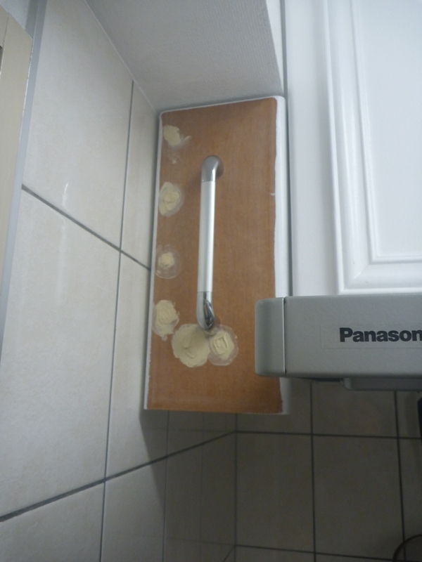 最初は、吊り戸棚の扉の一番下っ端に合わせて設置しましたが、家内と娘はもう少し上へ上げた方が良いと宣うのでした。(笑)