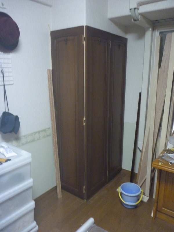 最初は、奥行が30センチくらいのタンスを作って、その中に化粧台を作る計画があったのですが、どういう訳か?家内は部屋の隅の所にタンスの扉を置けないか?と聞かれました。