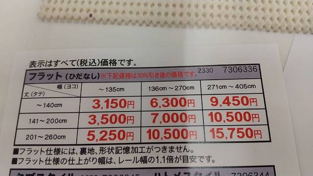 そして、本日ニトリ店舗へ行き担当者とお会いして、あらかじめお話していた生地を購入する旨を伝えたところ、スタッフの尽力によって上との交渉で、上記の生地のみならばと言う条件で生地のみの購入が可能となり、幅150センチ長さ14メートルで安く購入出来ました。