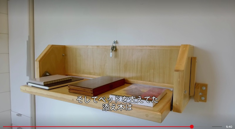 空間に無駄がありませんねえ。この収納ベッドは壁に固定されていますが、ベッドが水平になってもチェーンで吊っている様です。