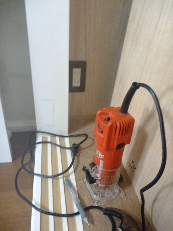 次は、キャビネットを柱に重量級の丁番で取り付ける為のスペースをトリマーにて掘ります。