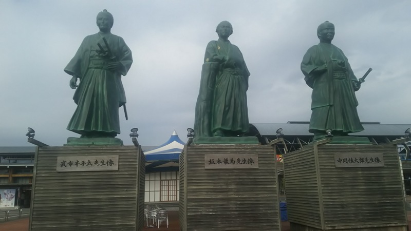 JR高知駅前の「こうち旅広場」の南側には、土佐勤王党を組織した武市半平太、海援隊の前身・亀山社中を結成した坂本龍馬、陸援隊を組織した中岡慎太郎の銅像が凛々しく立ち並んでいます。