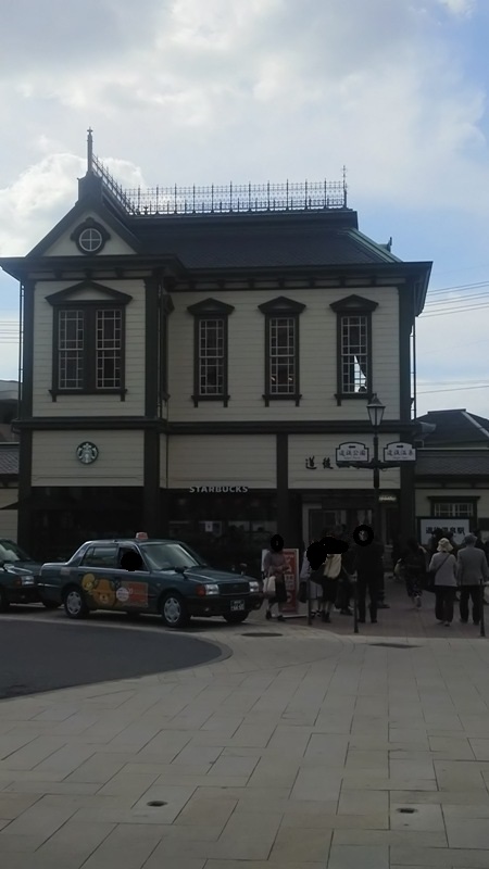 道後駅近くのスターバックスのお店です。右は有名な時計台です。