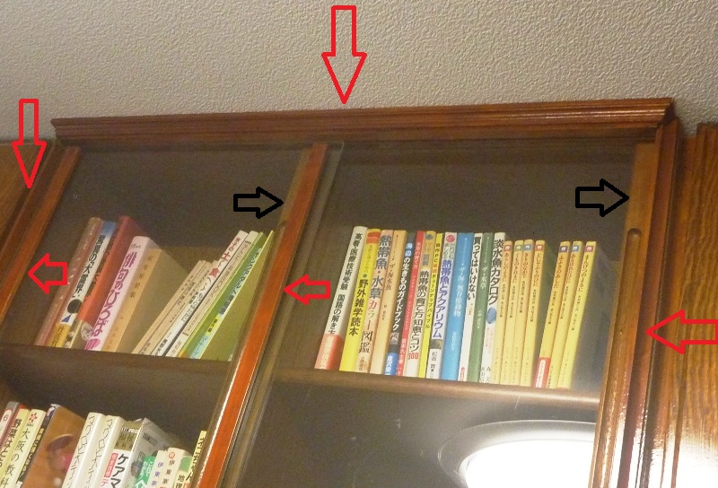 新たなガラス戸の赤い矢印の部分は、新たなガラス戸の補強部分です。