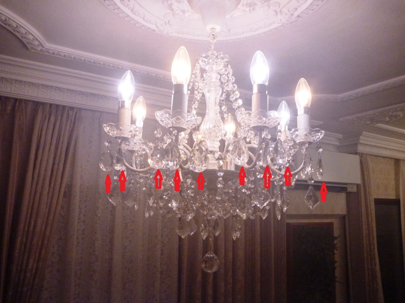 話変わりますが、ダイニングのシャンデリアの1つの受け皿に3個に「涙の雫タイプ中」を取り付けて計3×8で24個(51×31mm)を取り付けました。