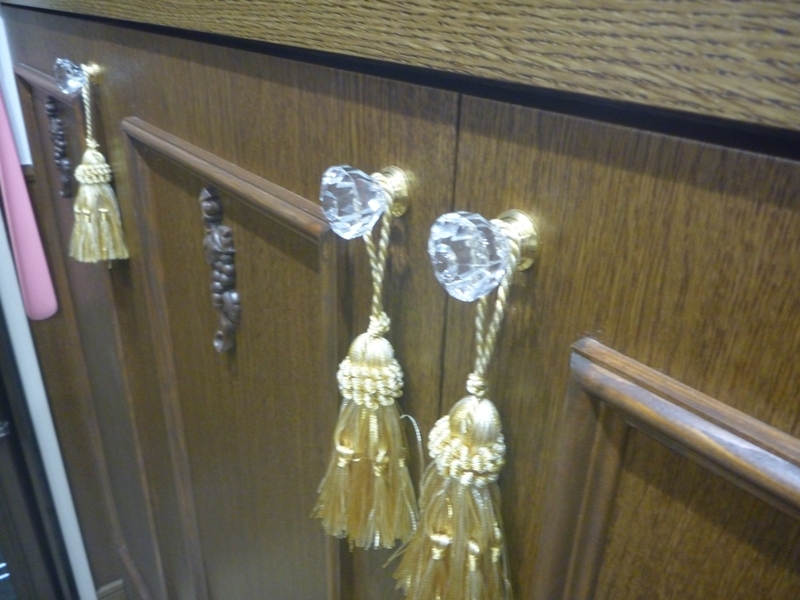 ごらんの様に、アクリル製のダイヤカットつまみ 台座部はダイカスト金メッキのドアノブに変更しました。