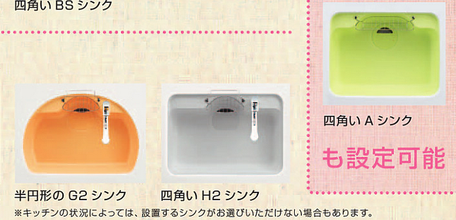 シンクの形が下図の様に3種類があり、左から巾がそれぞれ80、78、65になり、四角いH2シンクを選択する事になりました。