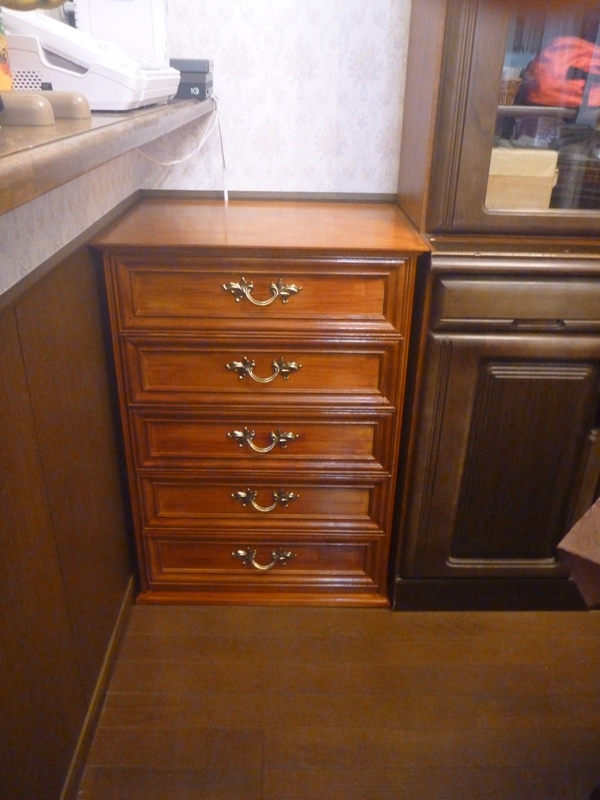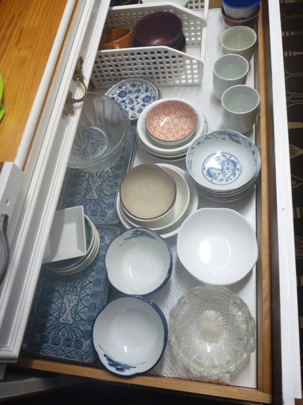最初は、上から2段目の引き出しが下の様な使い方を想定していなかった為、この様な使い方をされると底板の真ん中が凹にへこんで、3段目の引き出しの上縁に当たる事態が起きてしまいました。その為、内寸を測定して切った板を敷いて食器の重量に耐えられる様に再設置しました。
