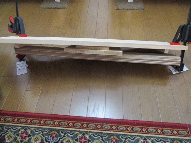 反ってしまった板を圧力をかける事によって、元の位置に戻そうと言う事ですが、所定の位置より.越えては困りますので、天板を元に戻して確かめて足りなければ、もう一回圧力をかけては何回も繰り返してやっています。
