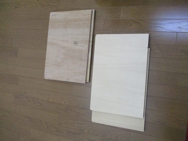 その必要とする合板の高さが2215ミリもあり、ホームセンタ-の安い普通の合板1800×900×9ミリを2枚を購入してカットしてもらい、部屋でつなげて2215×700?位×18ミリになる板を製作致しました。