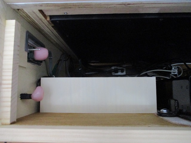 万一、子供がパソコン電源や銅線が見える箇所など触れない様に、安全の為に木の板や樹脂で絶縁しました。