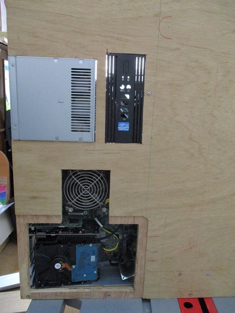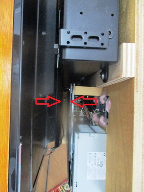 その結果、テレビの裏側にスペースがあり、そこへパソコンを収納を出来ないか?調べてみました。ブックサイズの小型PCも良いのですが、それだとPCが余ってしまう恐れがある為、現在あるパソコンで何とか出来ないかと調べた所、繋いでいるパソコンを分解してパーツだけテレビの裏側へ移設出来そうなので、パソコンケースからすべての部品を取り除きました。