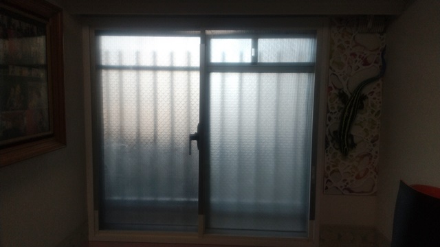 家内から、マンション廊下に面している洋室の窓が結露でビショ濡れとの話があり、その対策を施しました。(写真の右側に映っている生き物は、作り物です。(笑))