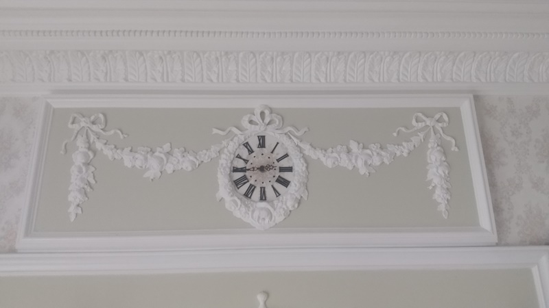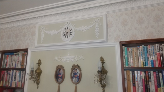 この様な訳で、リビングルームの時計パネルの壁紙をパステルグリーンに変更しましたら、やはりオーナメントが映えますのでいい感じです。