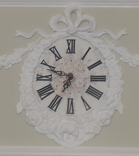 以前に、「最初は壁紙の模様にフラワ-があり、このフラワ-を時計の中心と設定した為に、壁紙の模様が周りの壁紙の模様とズレていた為、模様が目立たない様に白のペイントで薄く塗装したのですが、白すぎました。