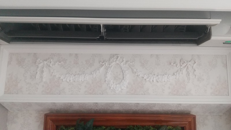 下の写真の様に、寝室の仏壇の上に装飾パネルに使われる壁紙にパステルグリーンを貼ってみたら、意外とオーナメントがクッキリと映えますので驚きました。